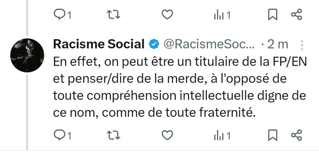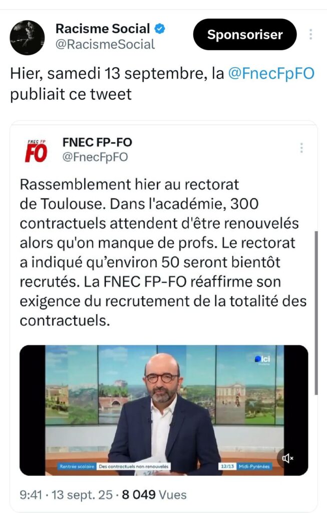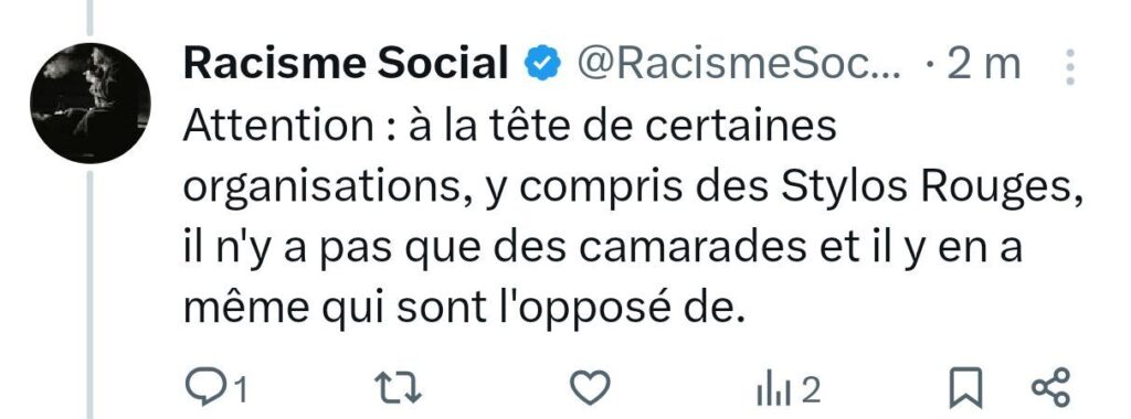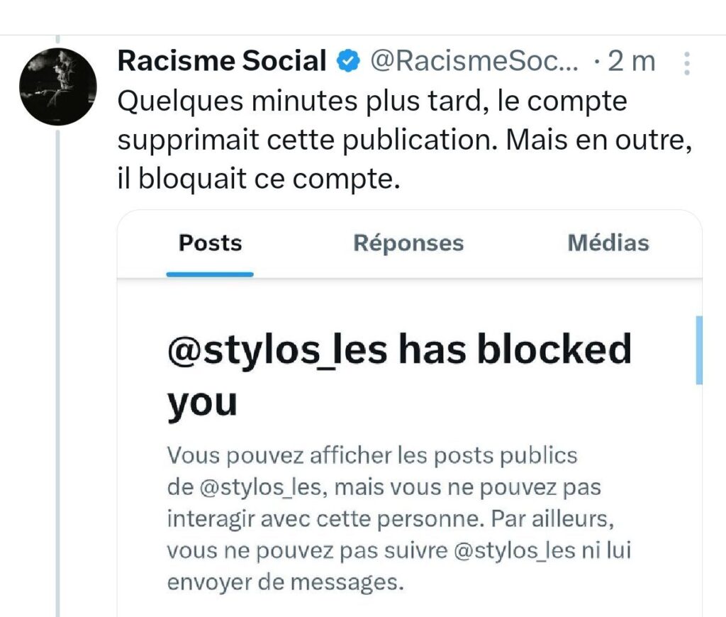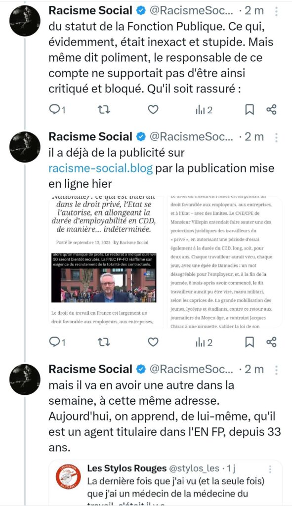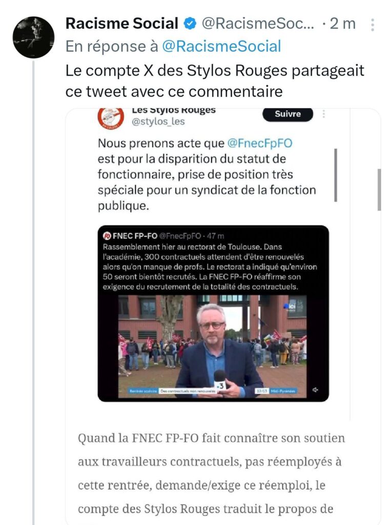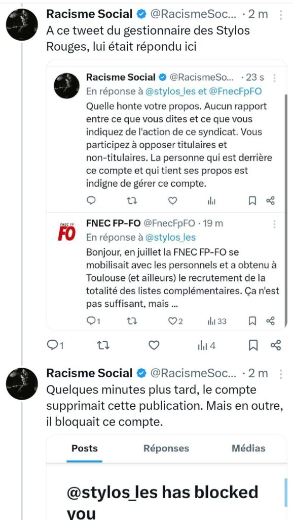 Certains échanges révèlent parfois des vérités sociales, politiques, désagréables, mais objectives. Ci-dessous, vous trouvez la reproduction d’une série de tweets, publiés par le compte « Racisme Social », lié à ce blog, qui relate ce qui s’est passé le samedi 13 septembre, en lien avec le compte X des Stylos Rouges. Il s’agit d’enfoncer le clou, puisque la personne qui gère ce compte s’est cru autorisée, un, à publier le tweet mis en cause (et ce pour répondre à une Fédération FO), deux, à bloquer ce compte, après qu’il lui été répondu que ce tweet était honteux – en supprimant ce tweet, ici, reproduit.