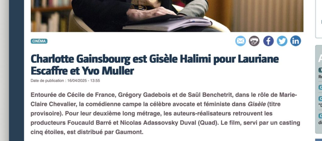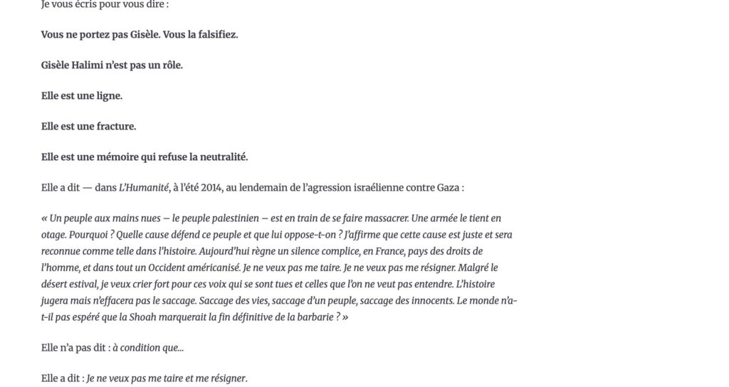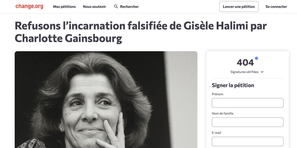 Une pétition est désormais publiée pour, ensemble, refuser l’incarnation/exploitation du nom et de la figure de Gisèle Halimi par Charlotte Gainsbourg. Pour la lire et la signer, c’est ici https://www.change.org/p/refusons-l-incarnation-falsifiée-de-gisèle-halimi-par-charlotte-gainsbourg?recruiter=1389094219&recruited_by_id=f62735b0-9709-11f0-bb9f-47ef02359eb3