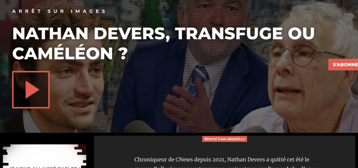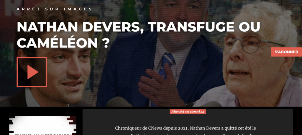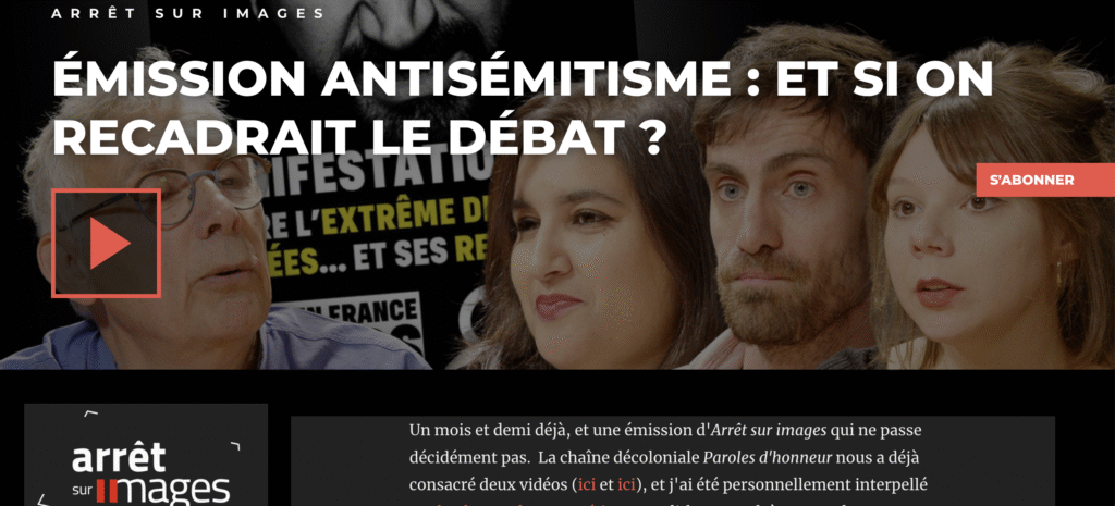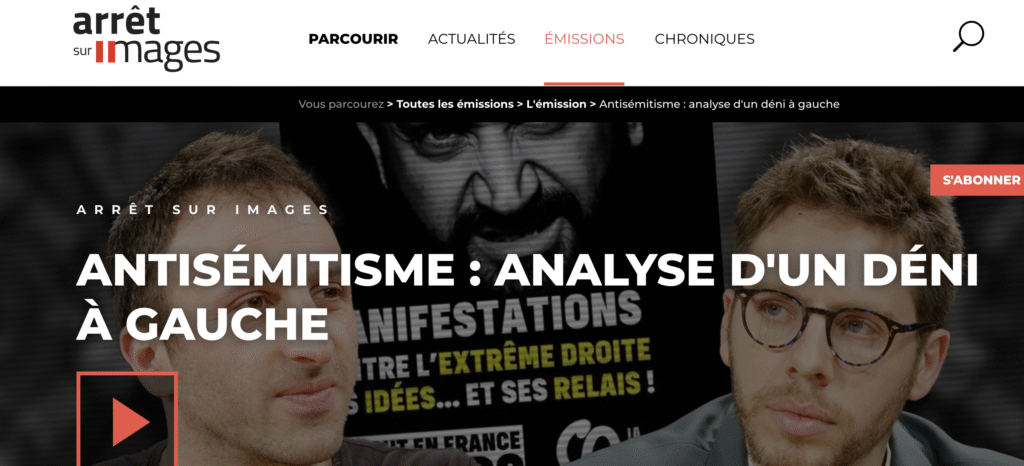 - choisir des interlocuteurs juifs, sionistes, y compris pour faire mine d’avoir une distance, d’être en désaccord, au moins partiel (comme ci-dessous, avec Nathan Devers, frauduleusement présenté comme un « philosophe », alors qu’il n’a aucune oeuvre attestée, ouverte, étudiée, et on ne confond pas livres publiés et oeuvre). Daniel Schneidermann a le goût de « dialoguer » avec celles et ceux qui se définissent par leurs mots et leurs actes comme des juifs sionistes. Les juifs anti sionistes, français et autres, sont interdits d’antenne sur ASI, comme sur Libération et Médiapart.